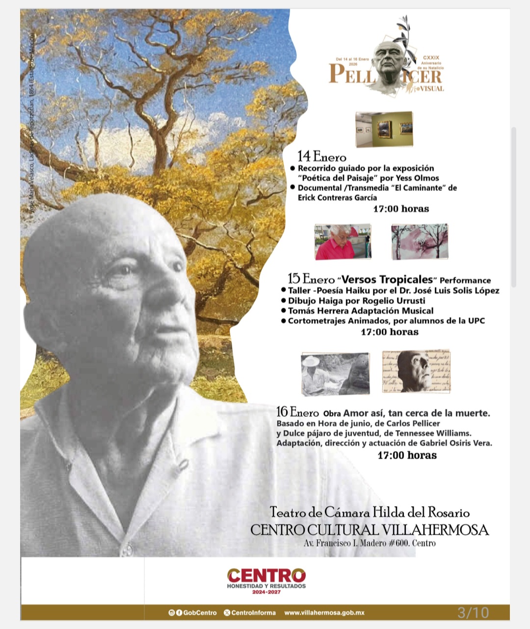 Arranca Centro 2026 con actividades en honor a Carlos Pellicer en la Agenda Cultural de enero