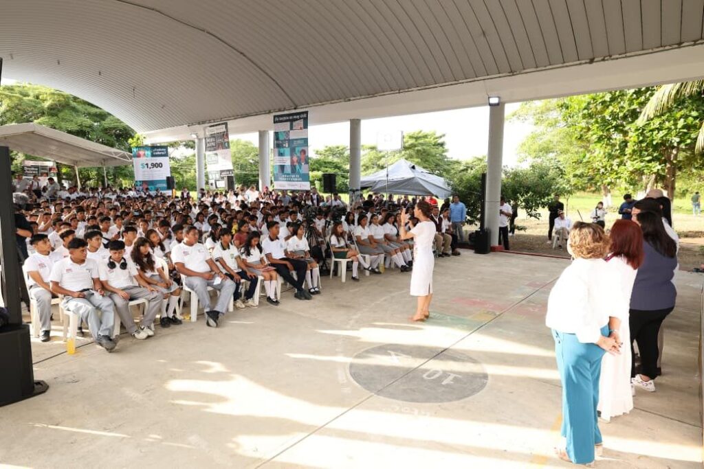 En su quinta visita del año al Edén de México, la mandataria nacional destacó que a la beca “Benito Juárez”, que en Tabasco beneficiará a más de 100 mil estudiantes del subsistema de educación media superior durante el presente ciclo escolar, se suma la beca “Rita Cetina” que atiende a más de 122 mil estudiantes tabasqueños del nivel secundaria, y por primera vez en la historia, beneficiará con estímulos económicos, a partir del año entrante, a más de 140 mil niñas y niños de las primarias públicas de la entidad.