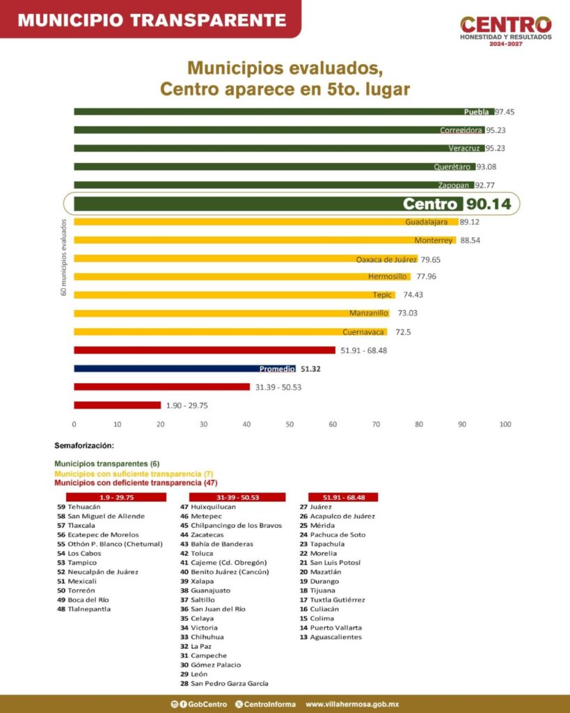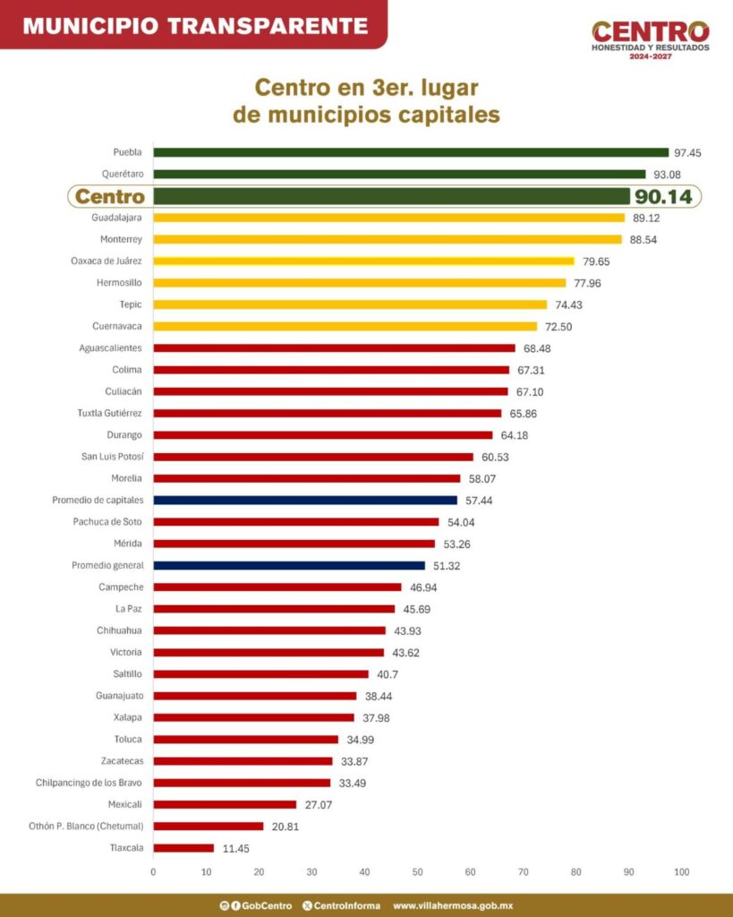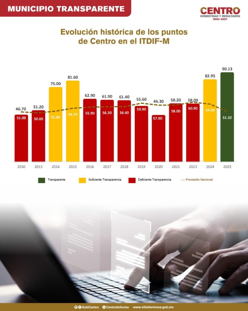 Villahermosa, Tab., 27 de noviembre de 2025.- El municipio de Centro obtuvo su puntaje más alto en el Índice de Transparencia y Disponibilidad de la Información Fiscal de los Municipios (ITDIF-M), elaborado por aregional, alcanzando por primera vez la categoría de Municipio Transparente, distinción reservada únicamente para quienes superan los 90 puntos.
