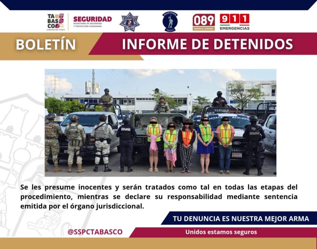 En operativos realizados en las inmediaciones de la colonia José María Pino Suárez, en Villahermosa, así como en la zona de la Ciudad Deportiva del municipio de Cunduacán, fueron detenidos Gabriel Alejandro “N”, alias “El Gabo”, de 24 años de edad; Diana Laura “N”, de 28 años; María Félix “N”, de 47 años; Luisa “N”, de 34 años; y una menor, de 17 años de edad.