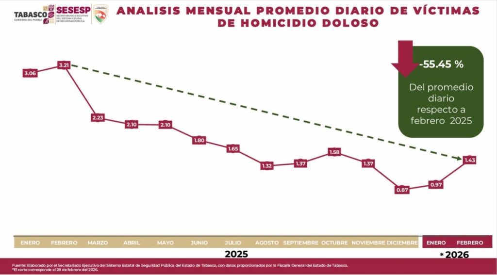 Producto del trabajo coordinado de las instituciones que integran la Fuerza Interinstitucional de Reacción Táctica (FIRT) Olmeca, se reportó que durante el bimestre enero-febrero se mantuvo a la baja el delito de homicidio con un promedio diario de 1.18 víctimas y 70 eventos, comparados con los 185 registrados en el mismo periodo del 2025.
