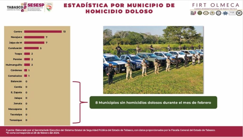 En Tabasco se avanza a paso firme en el combate a la delincuencia y la consolidación de una paz duradera, con una disminución durante febrero del 62.16 por ciento en homicidios dolosos, así como una baja generalizada en diversos delitos.