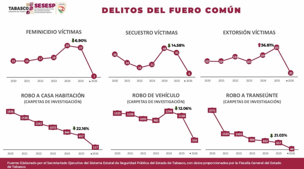 Puntualizó que, en la comparativa 2024 contra 2025, delitos como el feminicidio, presenta una disminución del 6.9 por ciento, y en lo que va de 2026 sólo hay un evento registrado. El secuestro ha registrado una baja del 14.58 por ciento, mientras que el robo a casa habitación disminuyó 22.16 por ciento, 12.06 el robo de vehículo y 21.03 el robo a transeúnte.
