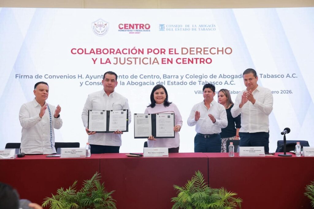 Villahermosa, Tab., 19 de enero de 2026.- Con el objetivo de fortalecer el acceso a la justicia y la atención integral a mujeres en situación de vulnerabilidad, el Ayuntamiento de Centro firmó los convenios de colaboración “Derecho a la justicia en Centro” con la Barra y Colegio de Abogados de Tabasco y el Consejo de la Abogacía del Estado de Tabasco.