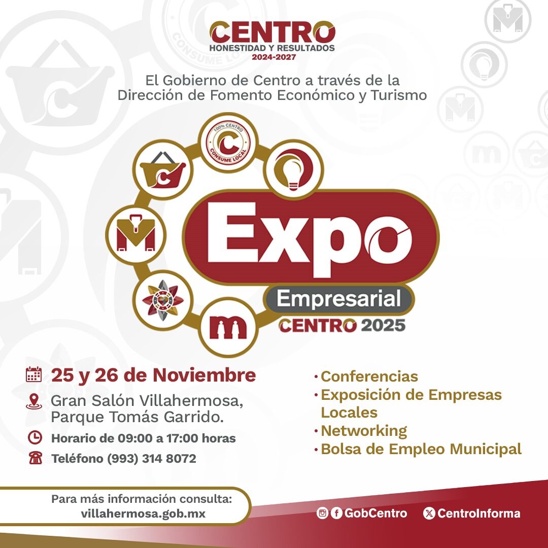 Villahermosa, Tab., 24 de noviembre de 2025.- El gobierno municipal, que encabeza la alcaldesa Yolanda Osuna Huerta, invita este martes a la Expo Empresarial Centro 2025 con la participación de 18 cámaras empresariales y que contempla conferencias, exposición de empresas locales, zonas académicas y de empleo, talleres y networking.