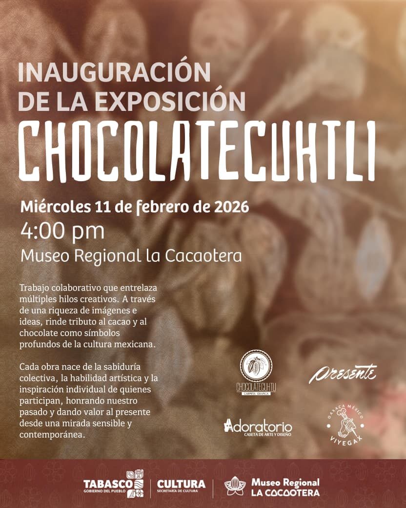 La inauguración de la muestra colectiva que rinde homenaje al cacao y al chocolate como símbolos fundamentales de la cultura mexicana se llevará a cabo este miércoles 11 de febrero de 2026, a las 16:00 horas, en el Museo Regional La Cacaotera.
