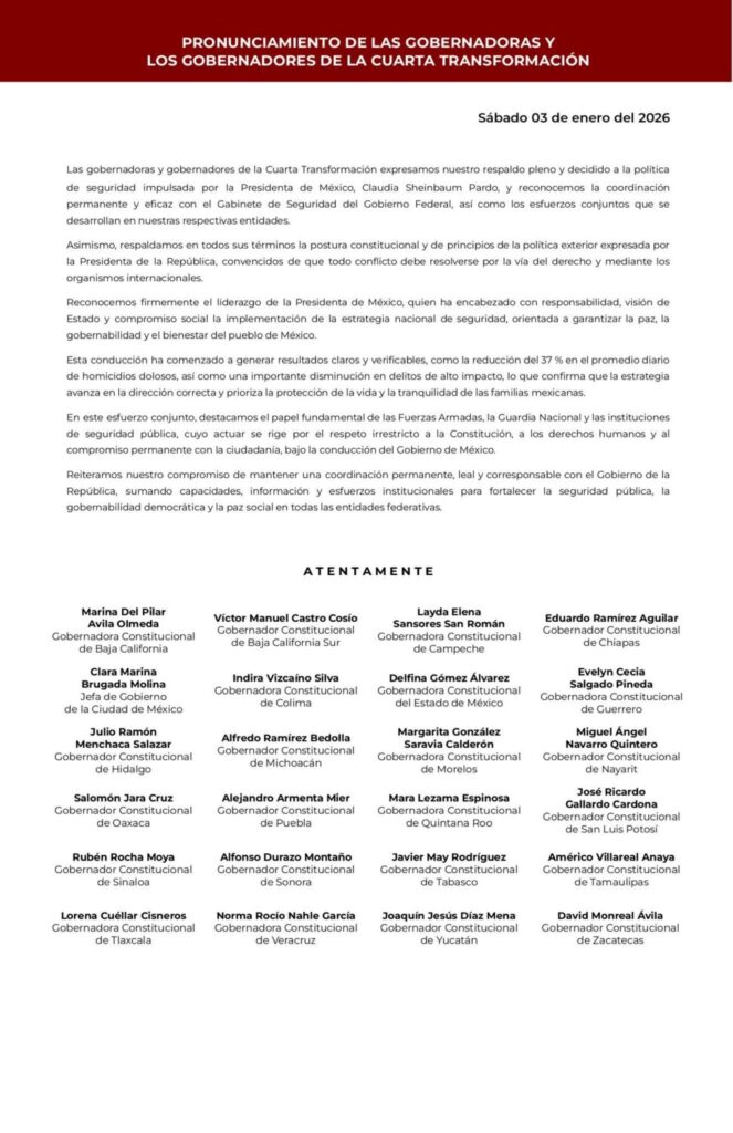Las gobernadoras y gobernadores de la Cuarta Transformación expresamos nuestro respaldo pleno y decidido a la política de seguridad impulsada por la Presidenta de México, Claudia Sheinbaum Pardo, y reconocemos la coordinación permanente y eficaz con el Gabinete de Seguridad del Gobierno Federal, así como los esfuerzos conjuntos que se desarrollan en nuestras respectivas entidades.
