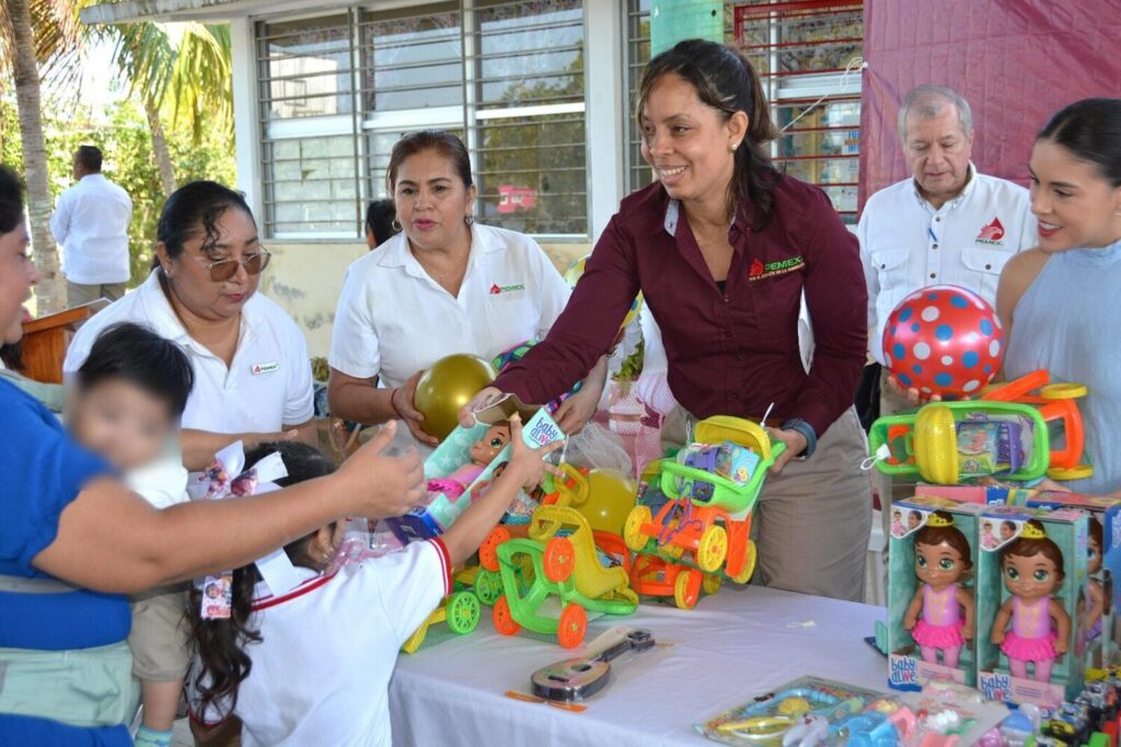 Paraíso, Tabasco. – Como parte de las acciones de compromiso social y vinculación con las comunidades, personal y voluntariado de Petróleos Mexicanos (Pemex) realizaron una jornada de convivencia y entrega de juguetes a niñas y niños de planteles de preescolar y primaria en la comunidad de la Isla Andrés García.