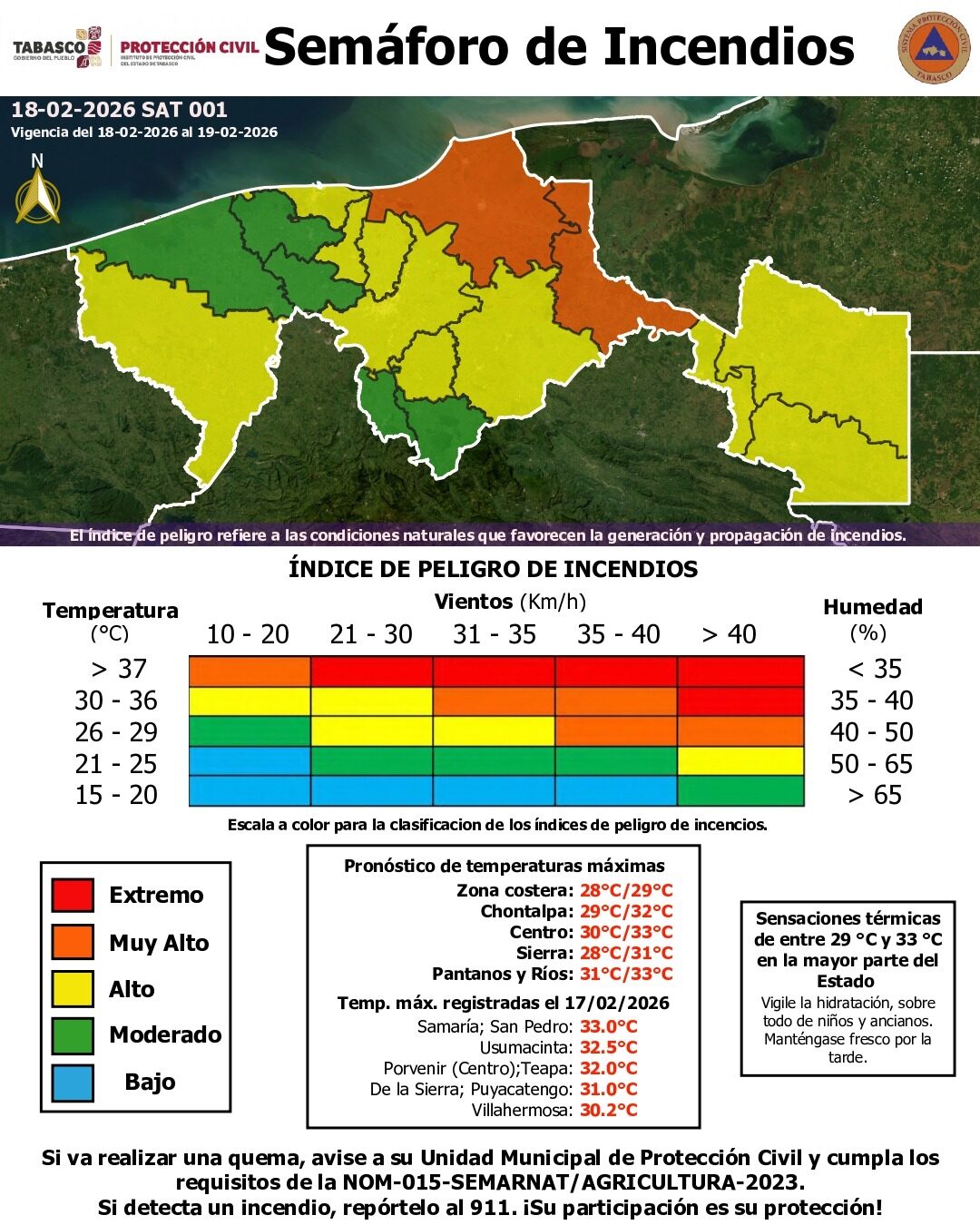 Villahermosa, Tabasco a 18 de febrero de 2026.- El Instituto de Protección Civil del Estado de Tabasco (IPCET) informó que, ante el inicio de la temporada de estiaje, se activó el Semáforo de Incendios, un producto informativo que se estará emitiendo y actualizando diariamente para dar a conocer el nivel de riesgo en cada municipio.