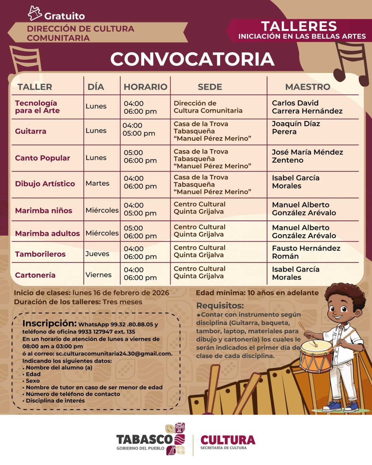 La Dirección de Cultura Comunitaria de la Secretaría de Cultura de Tabasco lanzó la convocatoria para participar en los talleres gratuitos de Iniciación en las Bellas Artes, dirigidos a niñas, niños, jóvenes y adultos a partir de los 10 años de edad.